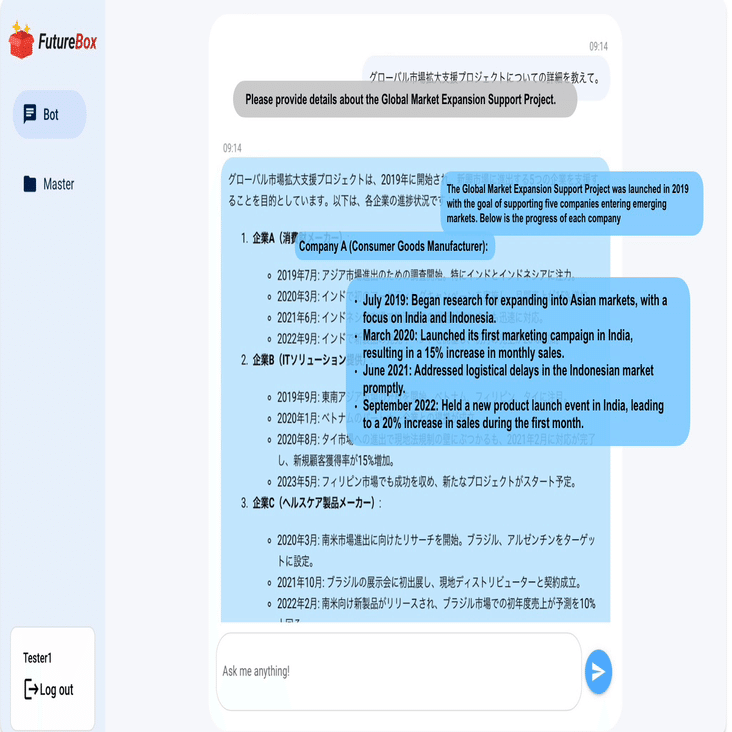 Future Box isn’t just a tool for improving work efficiency—it offers extensive customization options. For example, the ability to control what information a chatbot can provide has been applied by various companies for handling inquiries based on pre-loaded manuals.