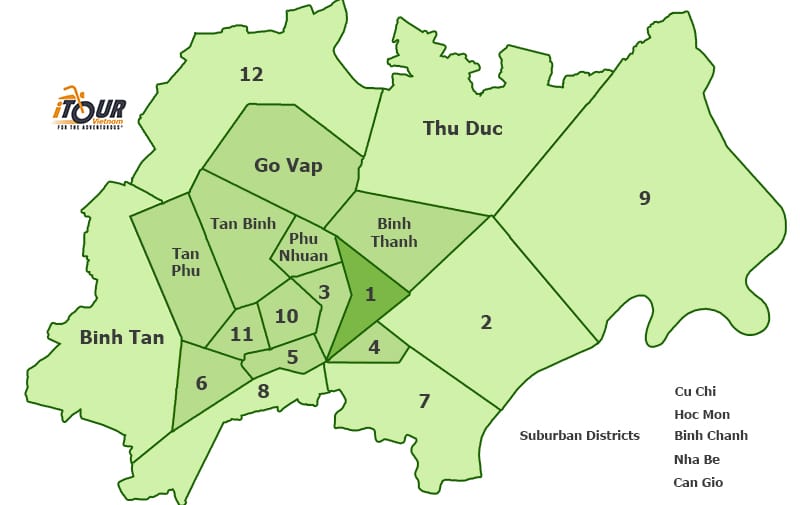 ホーチミン市は、経済の中心である「1区」を核として、2区〜12区、ビンタイン(Binh Thanh)区、フーニャン(Phu Nhuan)区、タンビン(Tan Binh)区、タンフー(Tan Phu)区、ゴーバップ(Go Vap)区などで構成されています。