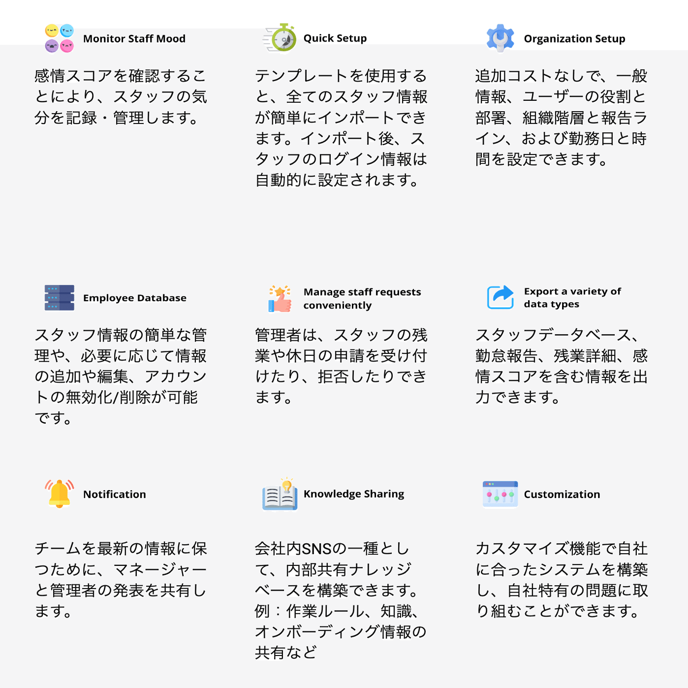 NikoNikoシステムは、組織、残業、一時的な休暇など、会社が管理する必要がある基本情報に加えて、会社の一般的な情報を管理することができるシステムです。