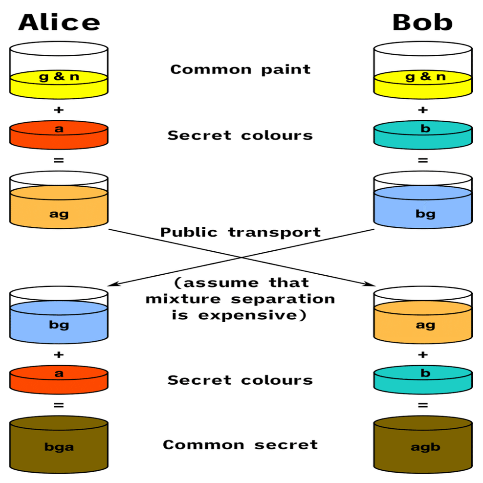 - これらは、アリスとボブのプライベートキーを数学的な計算を使って組み合わせることで結合されます => a + g = ag および b + g = bg。