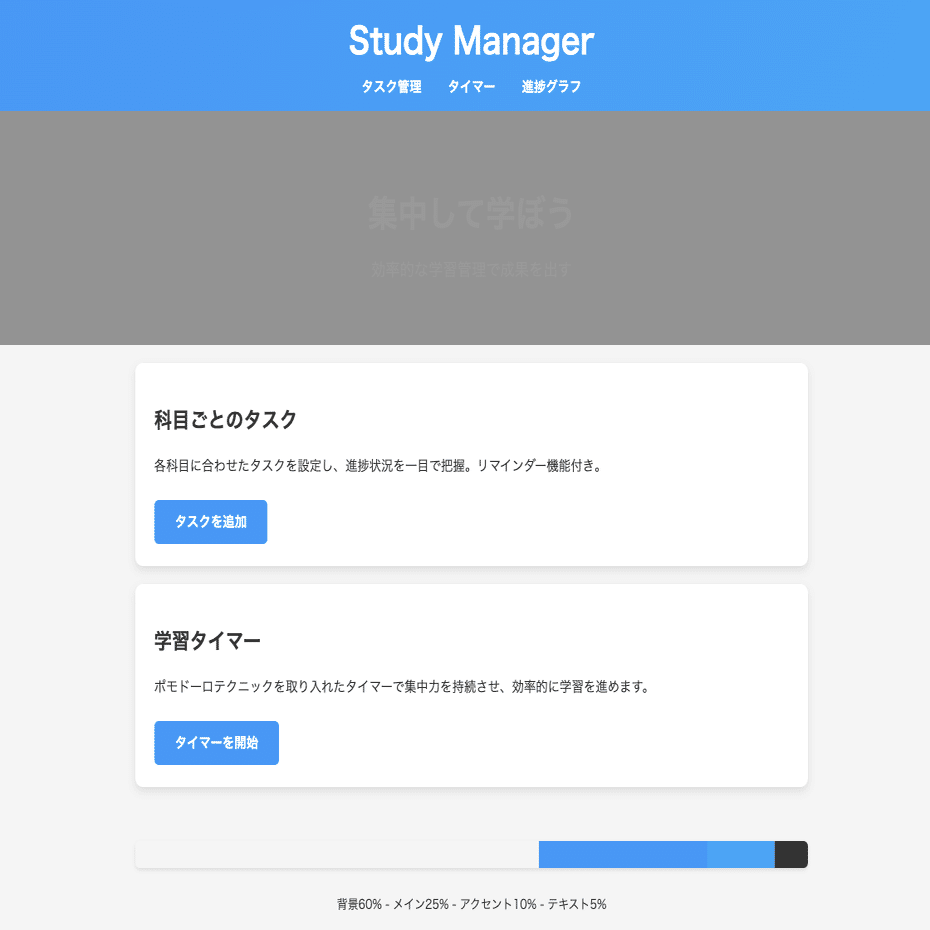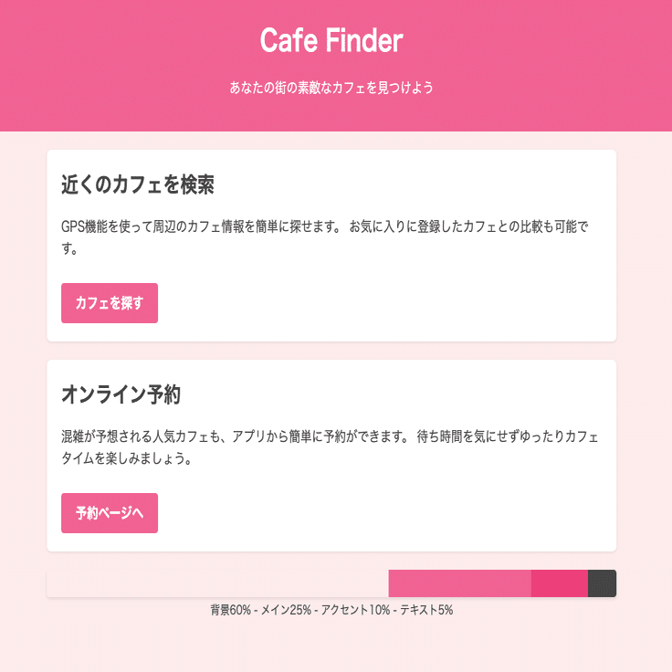 ページ下部に、全体の配色割合(背景60%・メイン25%・アクセント10%・テキスト5%)を視覚的に確認できるバーを配置しています。