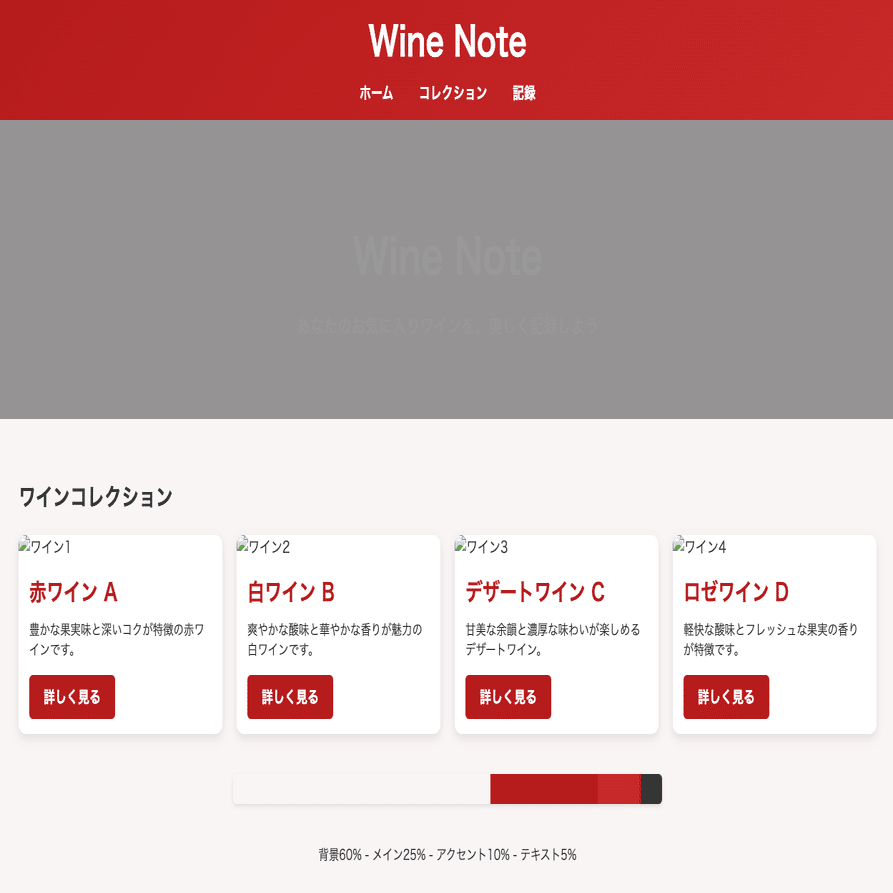 このHTMLサンプルを元に、さらに細部をカスタマイズしてオシャレなワイン管理アプリのUIを構築してみてください。