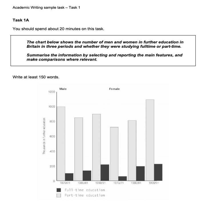 The chart below shows the number of men and women in further education in Britain in three periods and whether they were studying fulltime or part-time. Summarise the information by selecting and reporting the main features, and make comparisons where relevant.