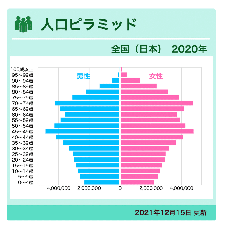 The chart shows the population of Japan in 2020, divided by age and gender. The blue bars represent males, and the pink bars represent females. The population is shown in different age groups, from 0 to 100+ years old.