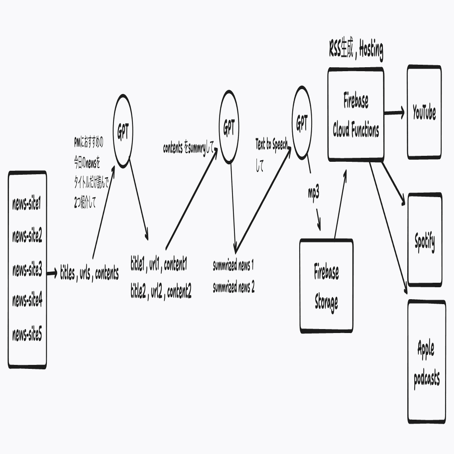 この一連のプロセスにより、ニュース記事を自動的に収集、要約、音声化し、各プラットフォームに配信するシステムを構築することができます。これにより、毎朝起きたら自動的に最新のニュースをラジオ形式で聞くことが可能になります。