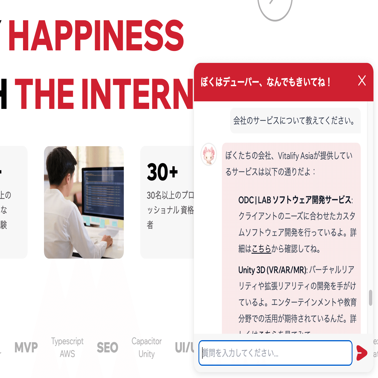 ぼくたちの会社、Vitalify Asiaが提供しているサービスは以下の通りだよ:ODC | LAB ソフトウェア開発サービス: クライアントのニーズに合わせたカスタムソフトウェア開発を行っているよ。詳細はこちらから確認してね。