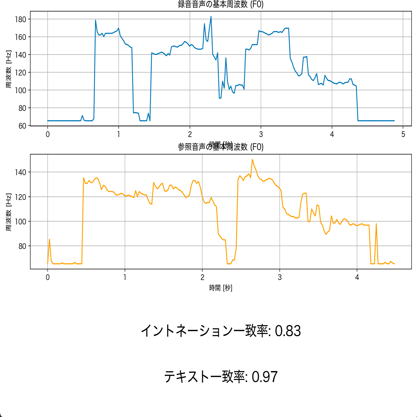 - 録音した音声と参照音声の基本周波数(F0)の違いをチェックして、“話し方の抑揚” が似ているかどうかを数値化。