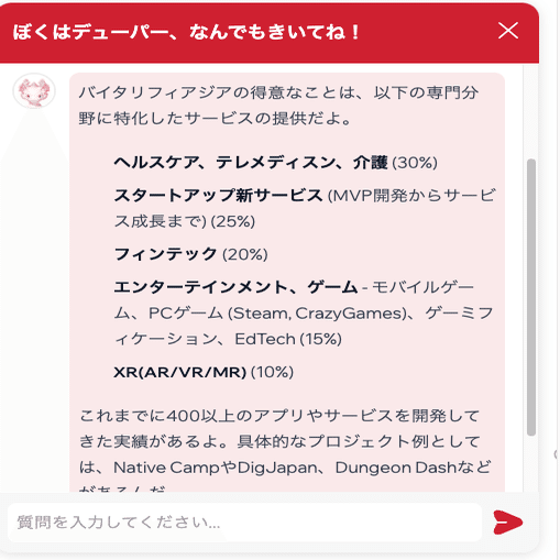 例えば、「バイタリフィアジアの得意なことは?」と聞いてみると