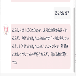 「あなたは誰?」と聞くと、しっかり回答をしてくれます。どうやら未来の地球からきて、いまは弊社のホームページ内に住んでいるようですね。